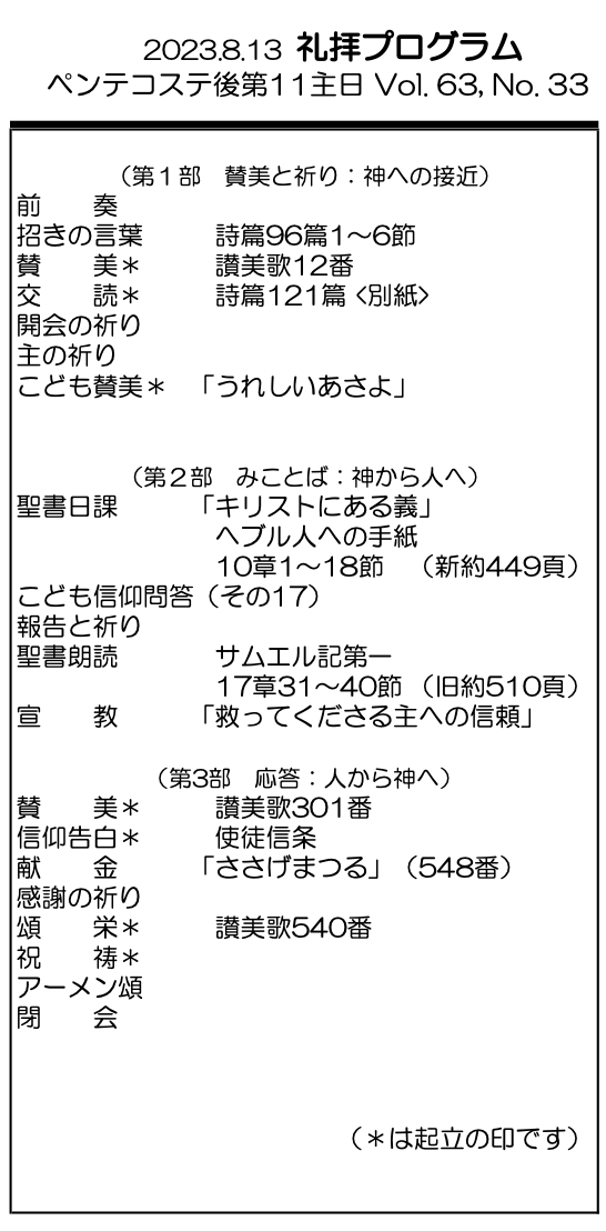 2023年8月13日 ペンテコステ後第11主日 /野村天路 師 「救ってくださる主への信頼」