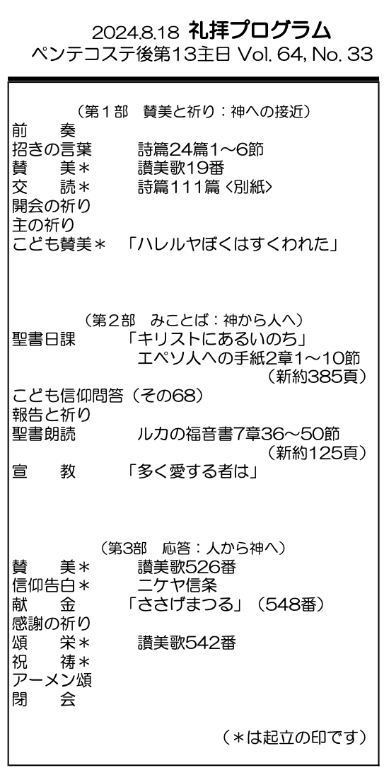 2024年8月18日 ペンテコステ後第13主日/原雅榮師(横浜永谷キリスト教会協力牧師) 「多く愛する者は」